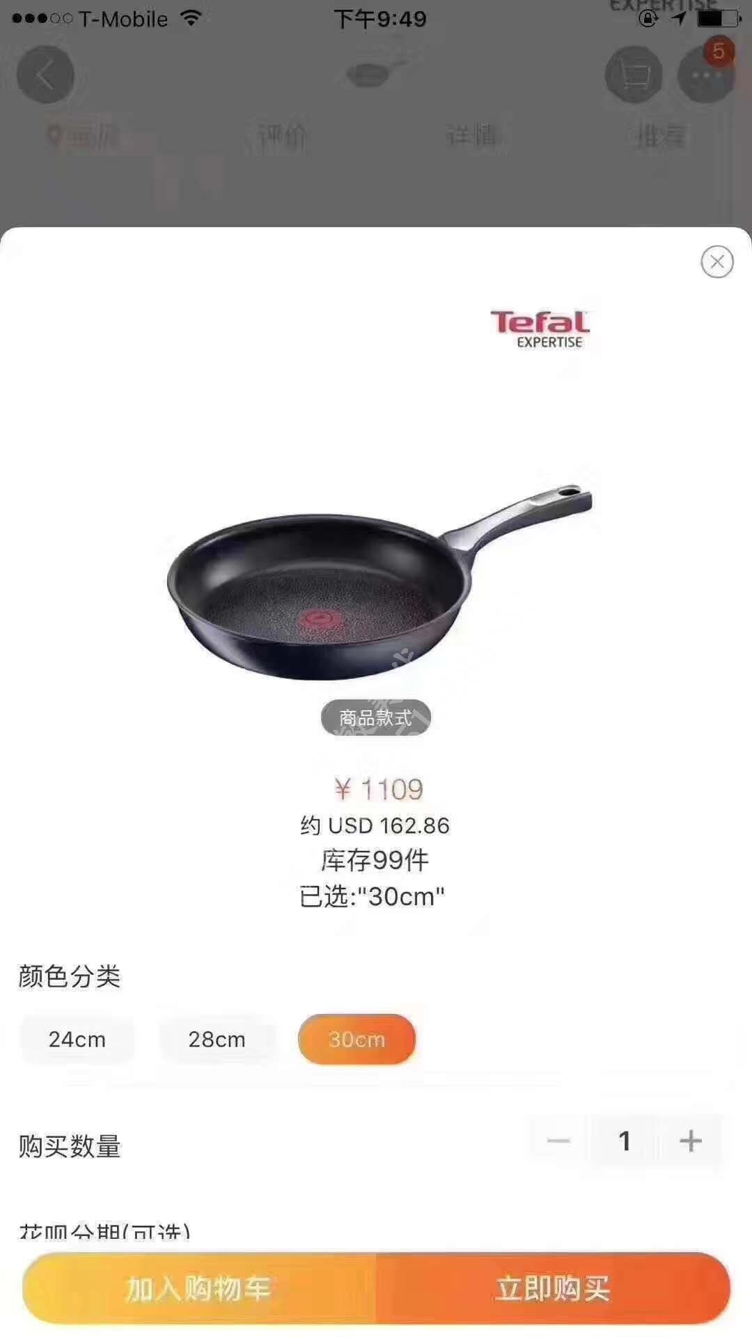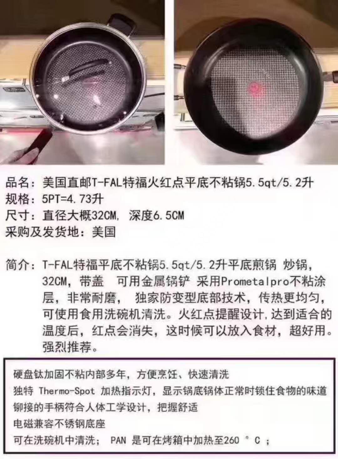 推荐法国特福T-FAL平底不粘锅,真心推荐,是我用最好洗的不粘锅 就算煎个荷包蛋我都不嫌大宁愿用这个煎法国品牌t-fal特福平底不粘锅5.5qt,5.2升,直径32cm左右. 锅中间的红点就是著名的thermo-spot红点技术,锅中央T-fal 专利的红点 “提醒信号”,达到最佳温度后,信号图案便会消失,这时候就可以放入食材了,苏泊尔的红点锅就是“借鉴”了这个设计。5.5qt/5.2升,深度6.5CM带锅盖,采用Prometal pro不粘涂层,非常耐磨,独家防变型底部技术,传热更均匀