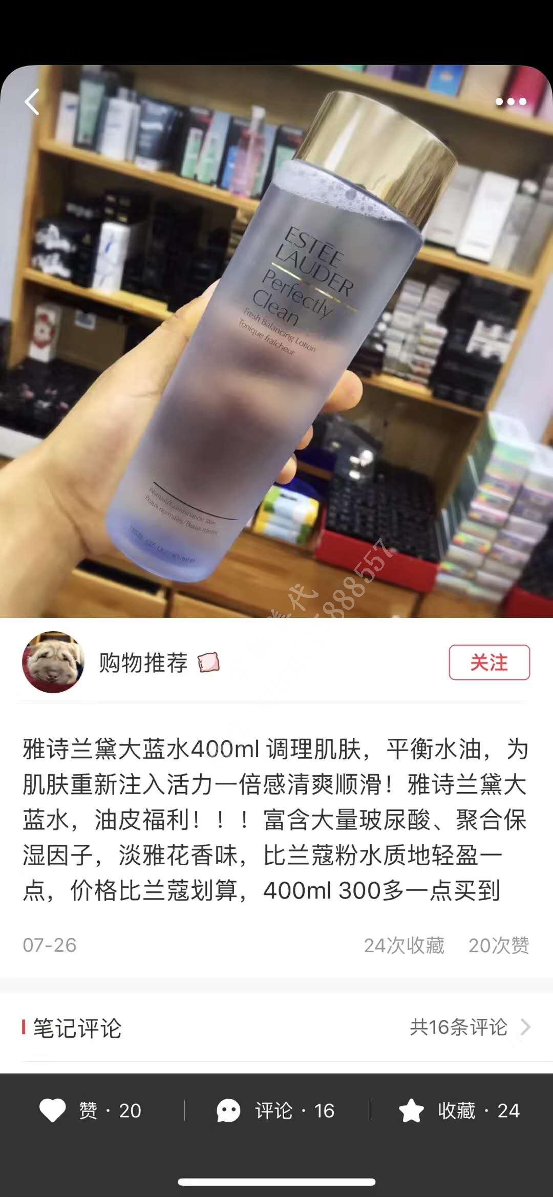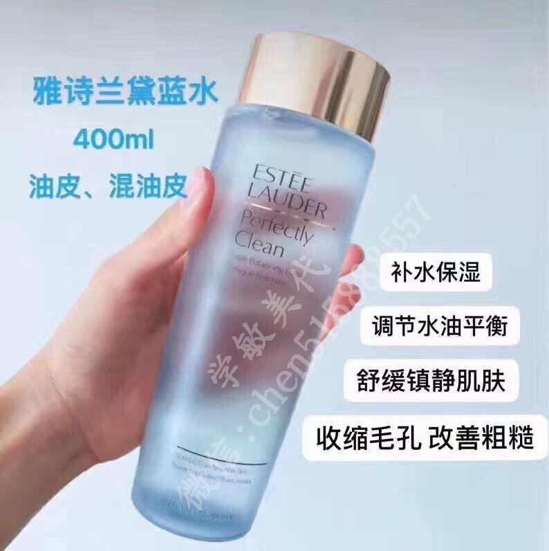 雅诗兰黛明星产品粉水/蓝水400ML,北美超值装限量版,美国生产,最重要的是产地不同,粘稠度不同!️粉水适合干性肌肤,保湿俱佳,干皮、沙漠肌,油皮的都绝对适用,毫无压力,对后续护肤品的吸收起着很大的帮助! 一瓶粉水=精华➕水!浓稠程度接近精华!容易吸收。虽然浓稠,但绝不闷痘!可以拿来敷水膜。蓝水适合混合性/油性肌肤,是专门针对油皮、混合皮设计的。对于年轻肌肤,容易爆痘,出油,大蓝水是不二选择!尤其是爆痘的时候,帮助肌肤水油平衡,清洁毛孔污垢!PS:专柜常年断货热销产品!