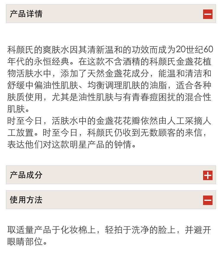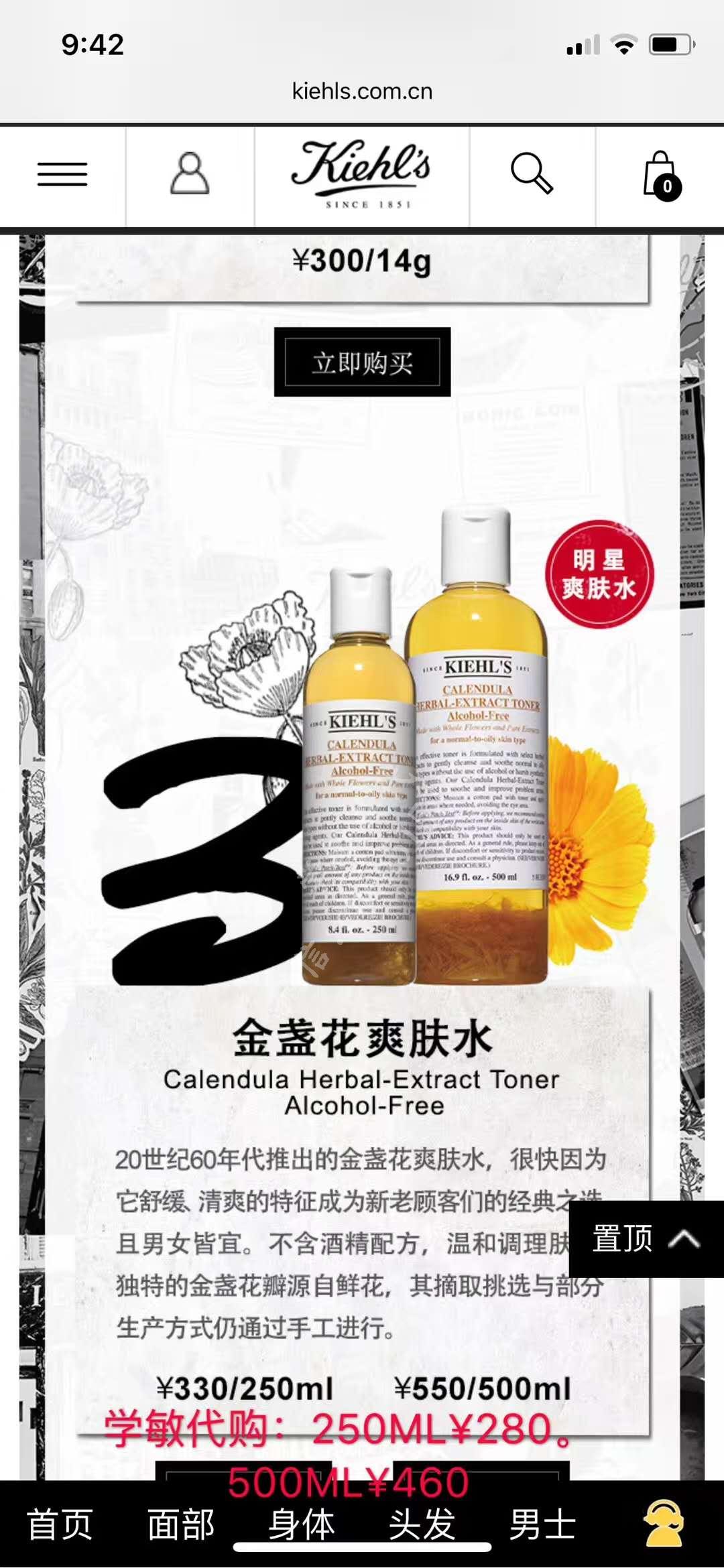 Kielh’s 第三大明星产品~金盏花水~ 萃取自金盏花卉及其它天然植物精华,可清洁、均衡、活化、调理肌肤,并且有助于青春痘疤痕之愈合,及改善轻微因粉刺而造成的感染发炎现象。不含酒精,天然金盏花成分,温和清洁和舒缓肌肤、均衡调理肌肤的油脂,深层补水,调节水油不平衡,有收紧皮肤的效果,改善皮肤过敏现象。250ML,500ML装