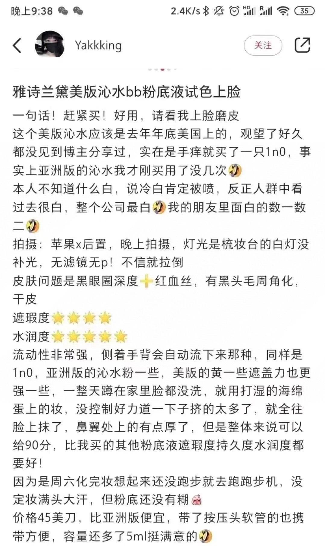 美版雅诗兰黛最新沁水粉底液35ml,水润持久不卡粉,干皮必备,干皮一定要买 一定要!雅l沁水粉底液 ,含83%精华水,水润效果持久一整天,且妆效柔和细腻,自然裸妆奶油肌,超服贴 不浮粉不卡粉。 最关键的是:持久不脱妆 不干燥~