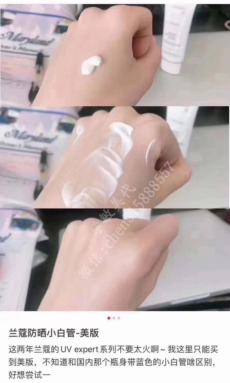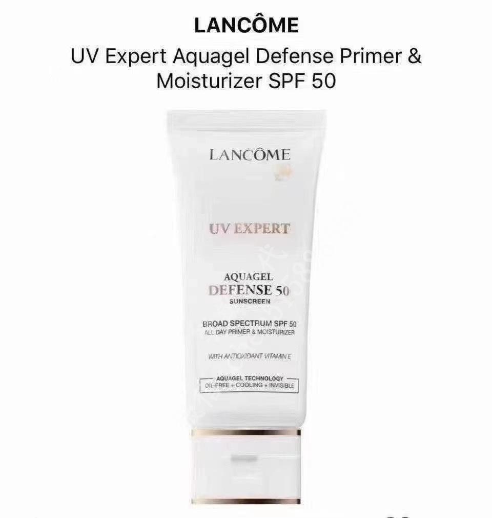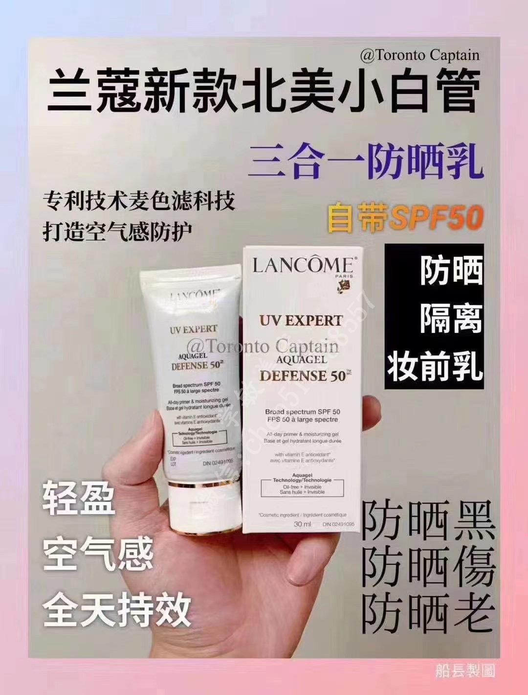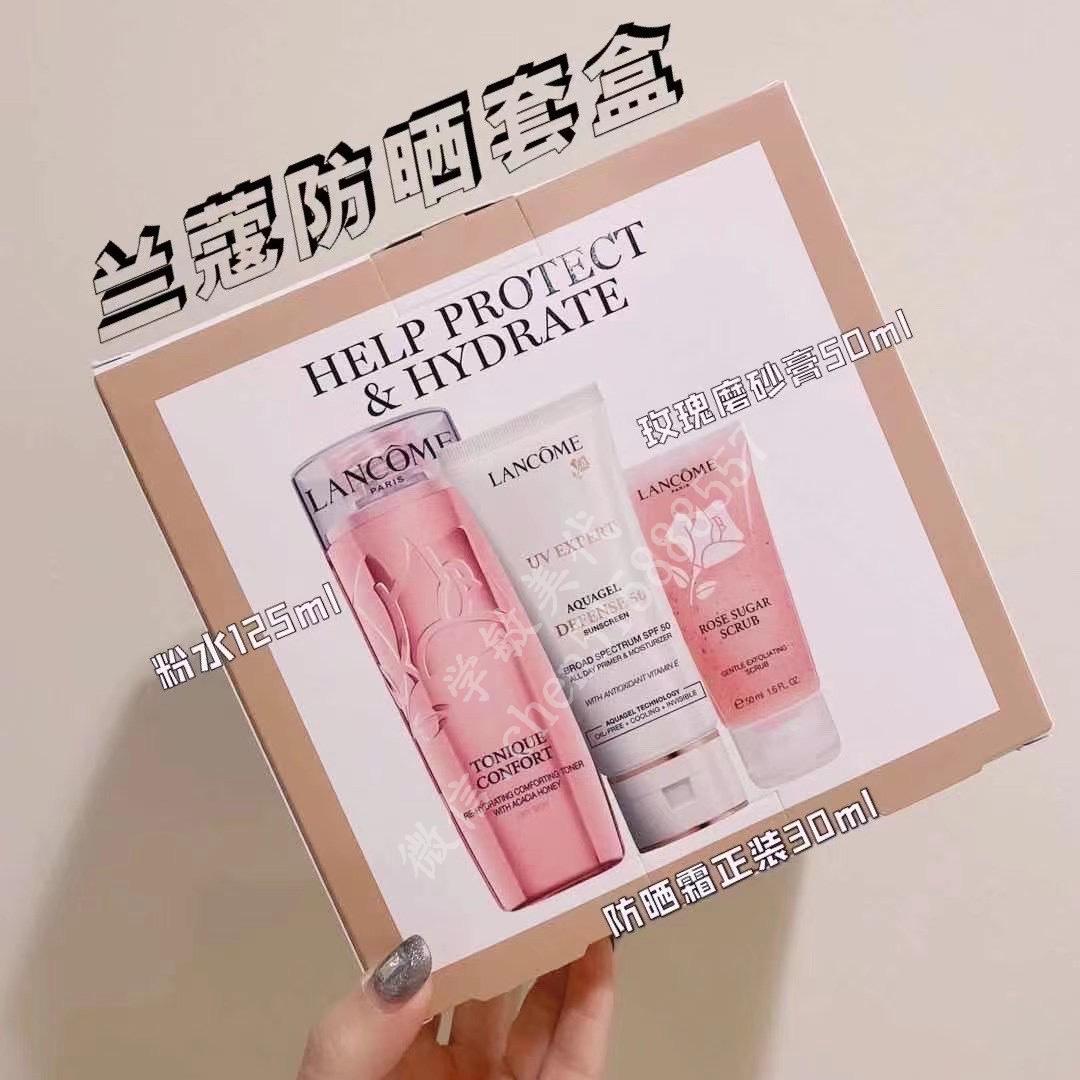 Lancôme新款防晒套盒: 防晒30ml+粉水125ml+磨砂膏50ml] 一年四季都必须的防晒 ! 超级好用的兰蔻小白管,防晒加隔离无油配方,敏感肌放心用,没用过的一定来试试。很逆天的一款防晒兰蔻空气感防晒霜, 美版只有30ml,和亚洲出的防晒不一样!! 含有抗氧化ve,降低底妆氧化脱妆的几率,50倍防晒指数,一款新柔皙清透防晒霜,很轻薄很轻薄很轻薄,当然防晒效果也很好☀用在护肤品的最后一步、彩妆的第一步。 也有隔离乳的效果☀防晒并不是防止晒黑哦,美白、防痘、抗老化都得靠防晒 这款清爽型,一点都不油腻。 推荐指数五颗星,单瓶国内版本的520¥,美版的找我