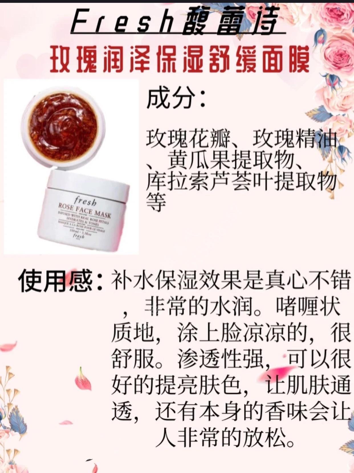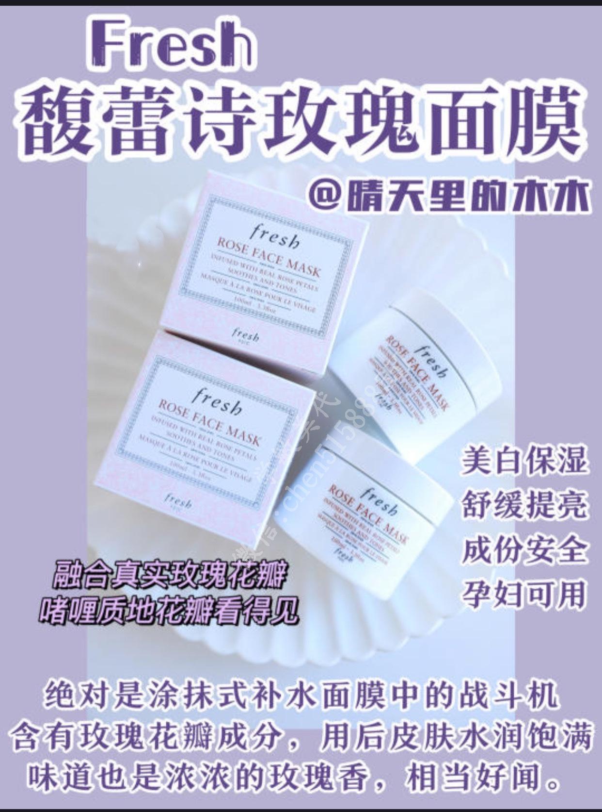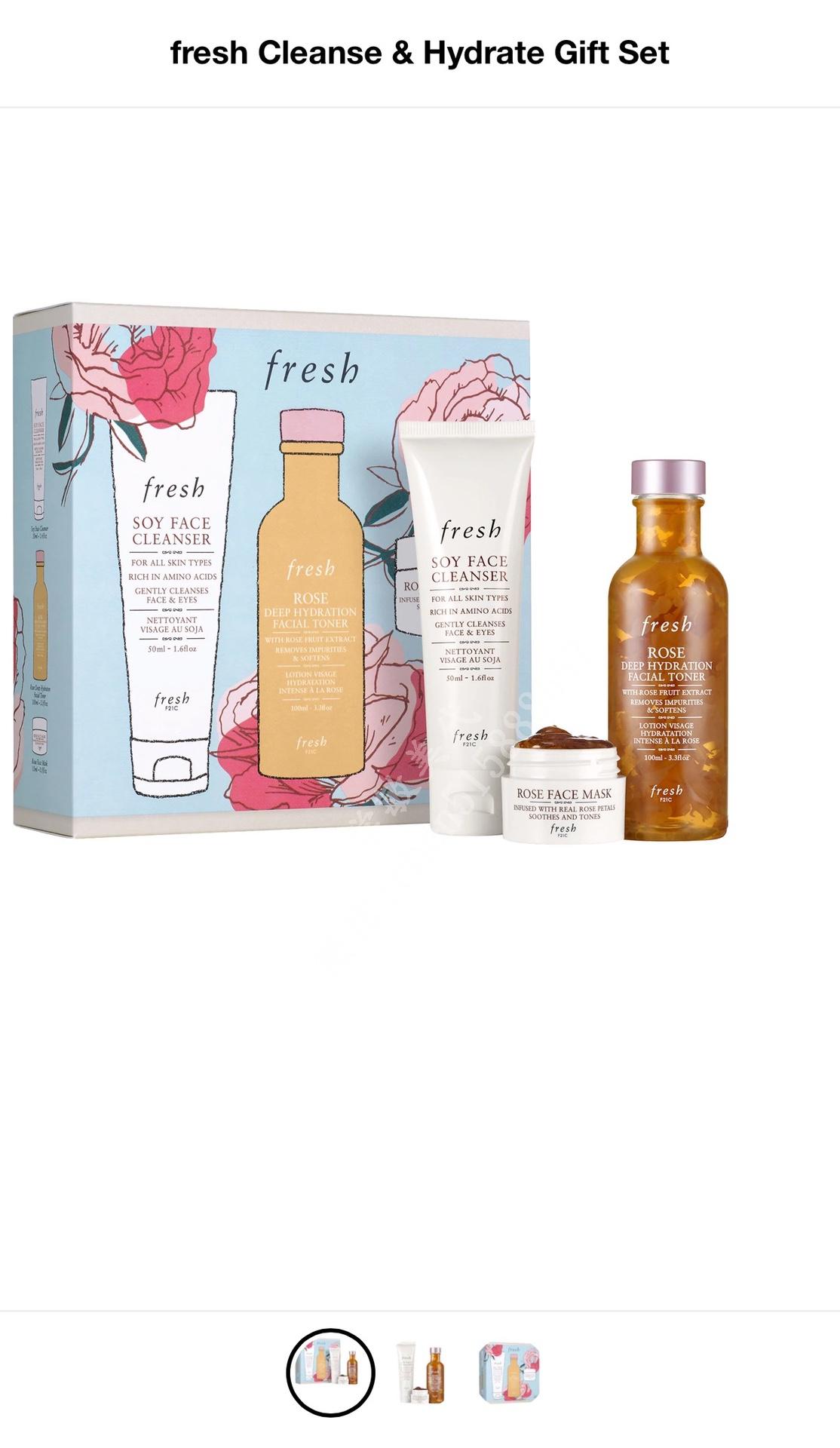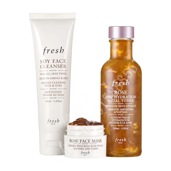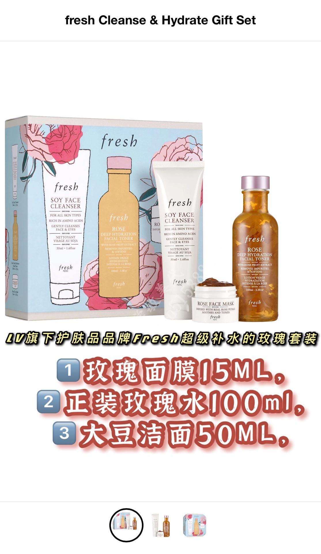 LV旗下护肤品品牌Fresh,超级补水的玫瑰三件套套装, Item No.2421832 包括: 1.玫瑰面膜15ML, 2.正装玫瑰水100ml, 3.大豆洁面50ML, 太划算了,一下省省几百块
