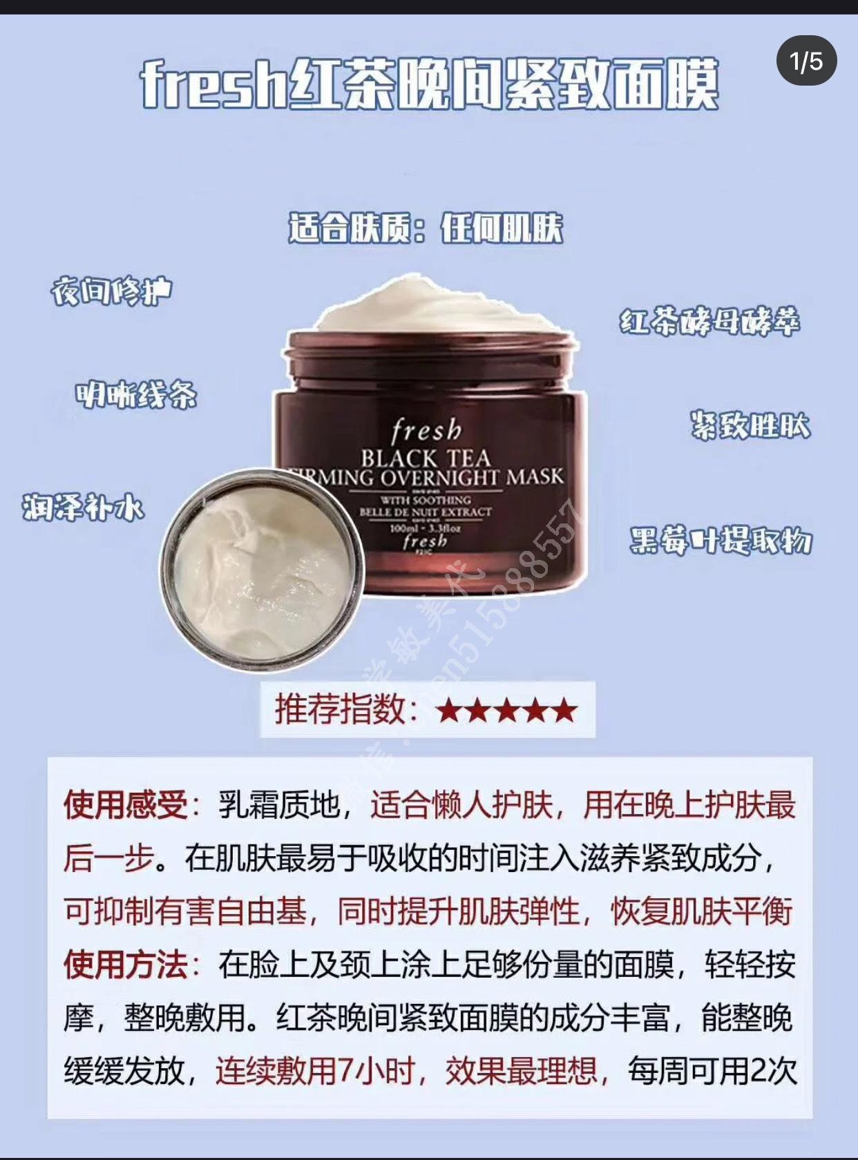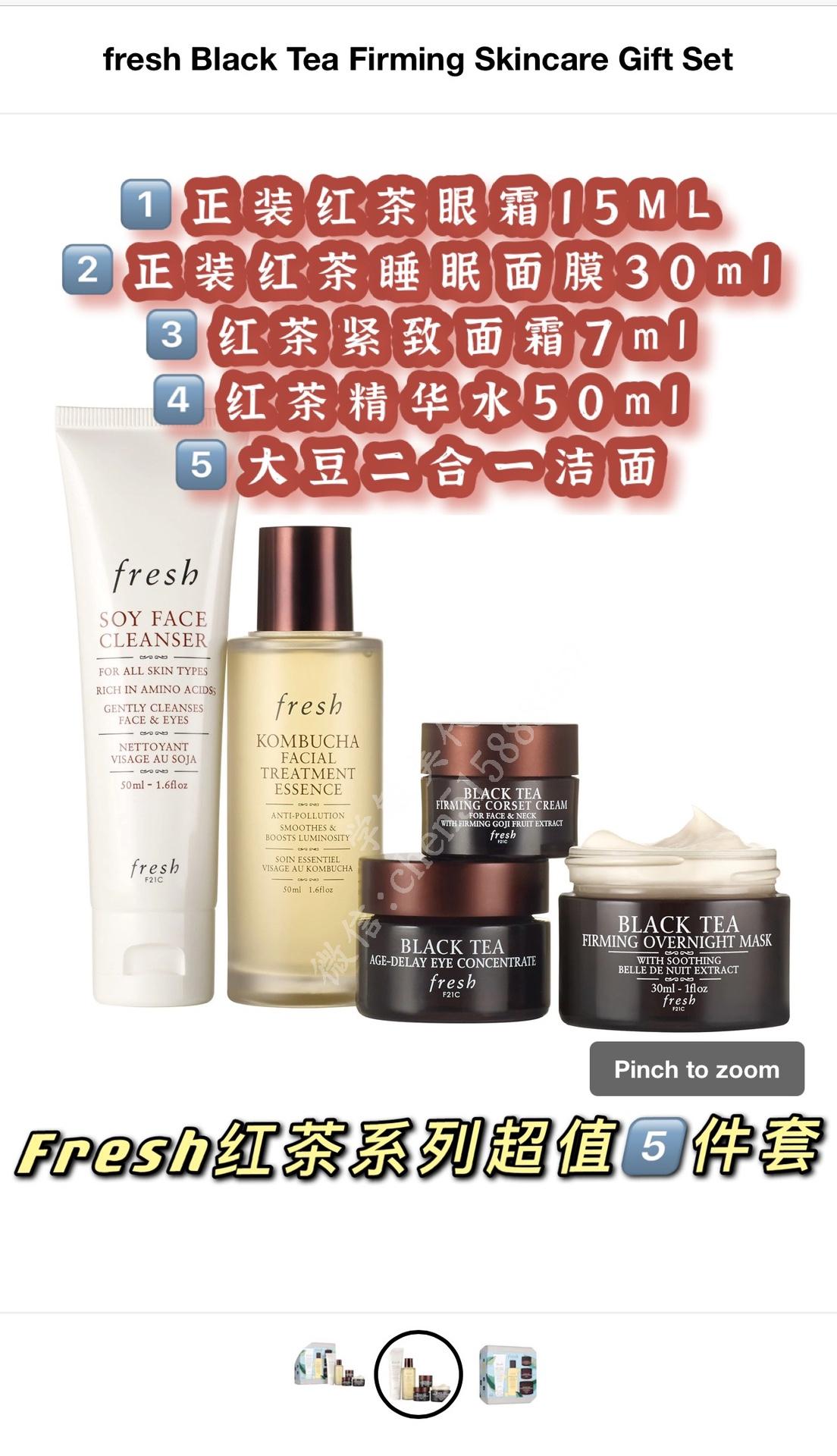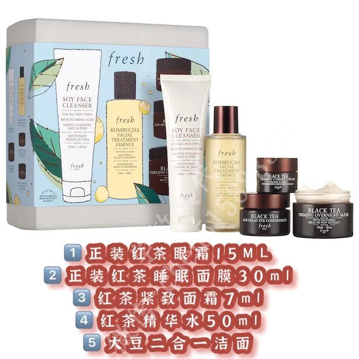 这套Fresh红茶系列超值!Item No.2421881 丝芙兰折扣~敏感肌肤可以用 Fresh红茶套装,这套集合红茶系列的明星产品 要买要买!喜欢fresh红茶系列的别错过 1.正装红茶眼霜15ML 2.正装红茶睡眠面膜30ml 3.红茶紧致面霜7ml 4.红茶精华水50ml 5.大豆二合一洁面50ML