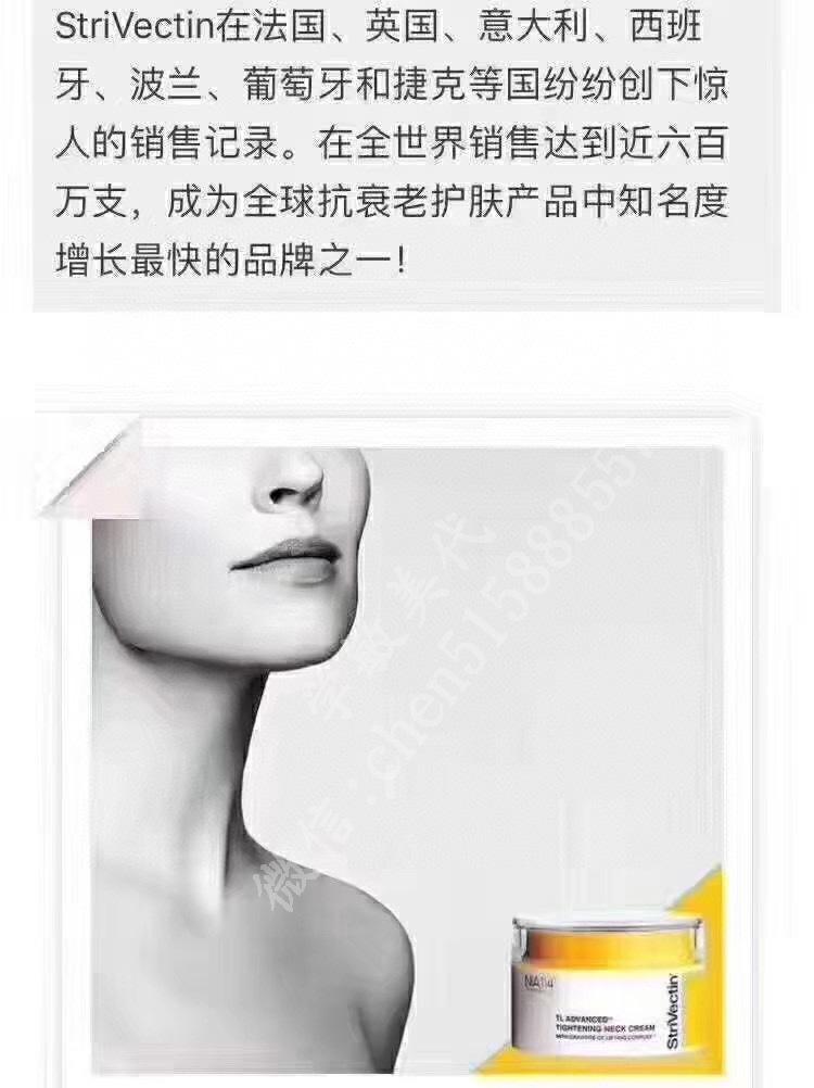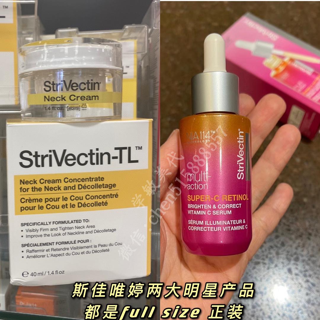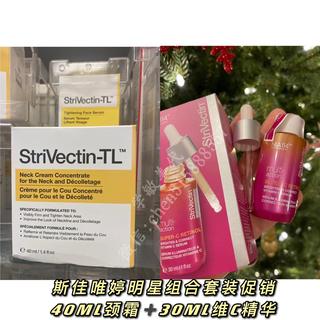 StriVectin颈霜+精华套装促销啦! 斯佳唯婷颈霜~美国销量第一的高效颈霜,高效配方淡化颈纹,女人容易看出年龄来的其实就是脖子了!高效去皱紧致颈霜,能提升皮肤张力,激发胶原蛋白的生成,滋润修复损伤 ,简单易吸收!! 斯佳唯婷VC亮白紧致精华,味道非常好闻,吸收超快,完全不粘腻,超温和!富含超高VC的西印度樱桃精华,上脸明显紧实、提亮去暗沉,且含有的视黄醇可平滑粗糙肌肤,淡化皮肤干纹和细纹,紧致肌肤 正装40ML+颈霜30ML精华两大套装,美国直邮