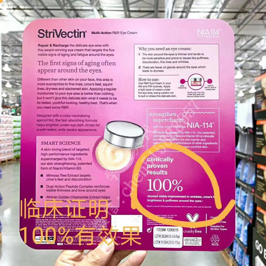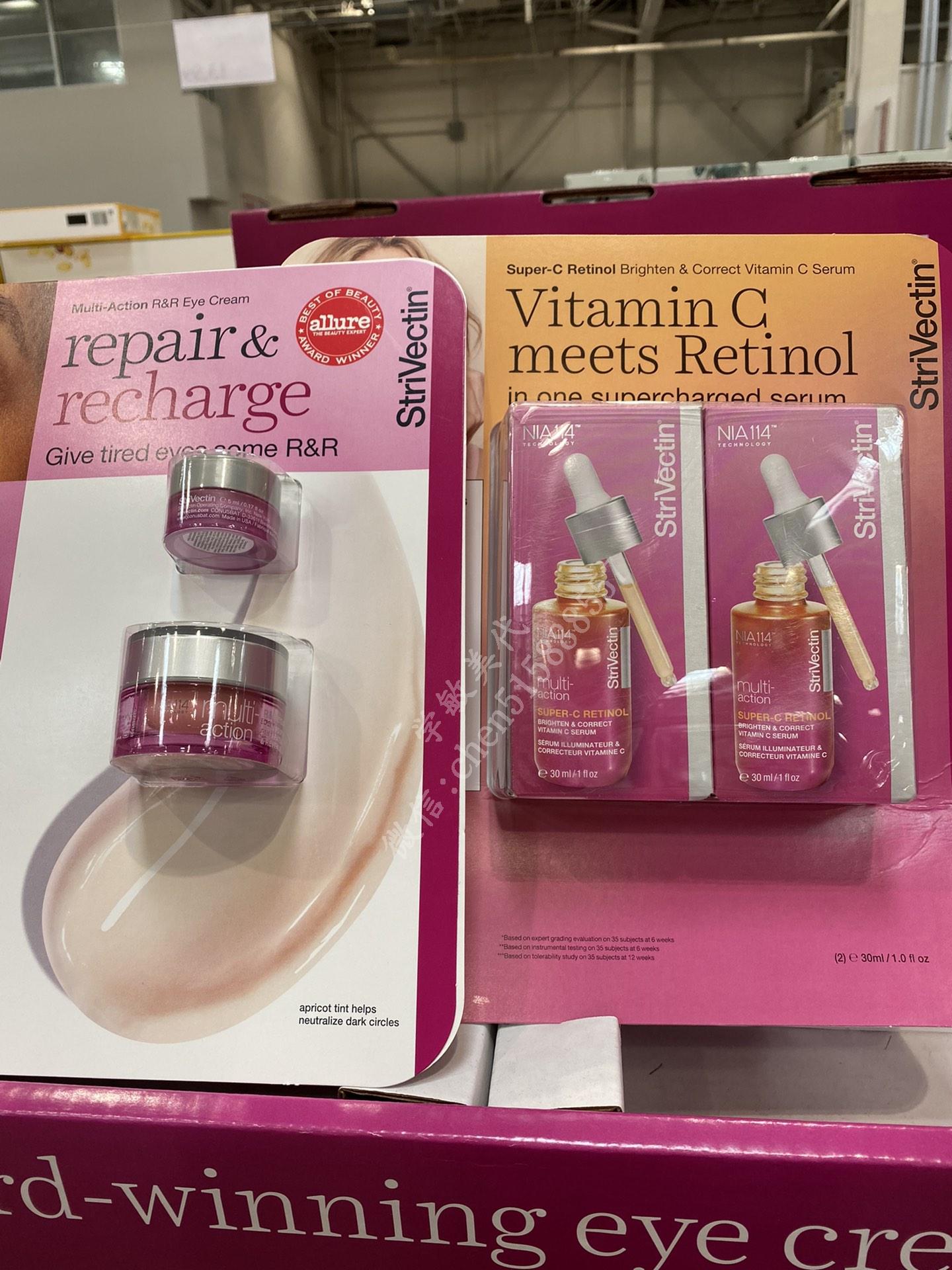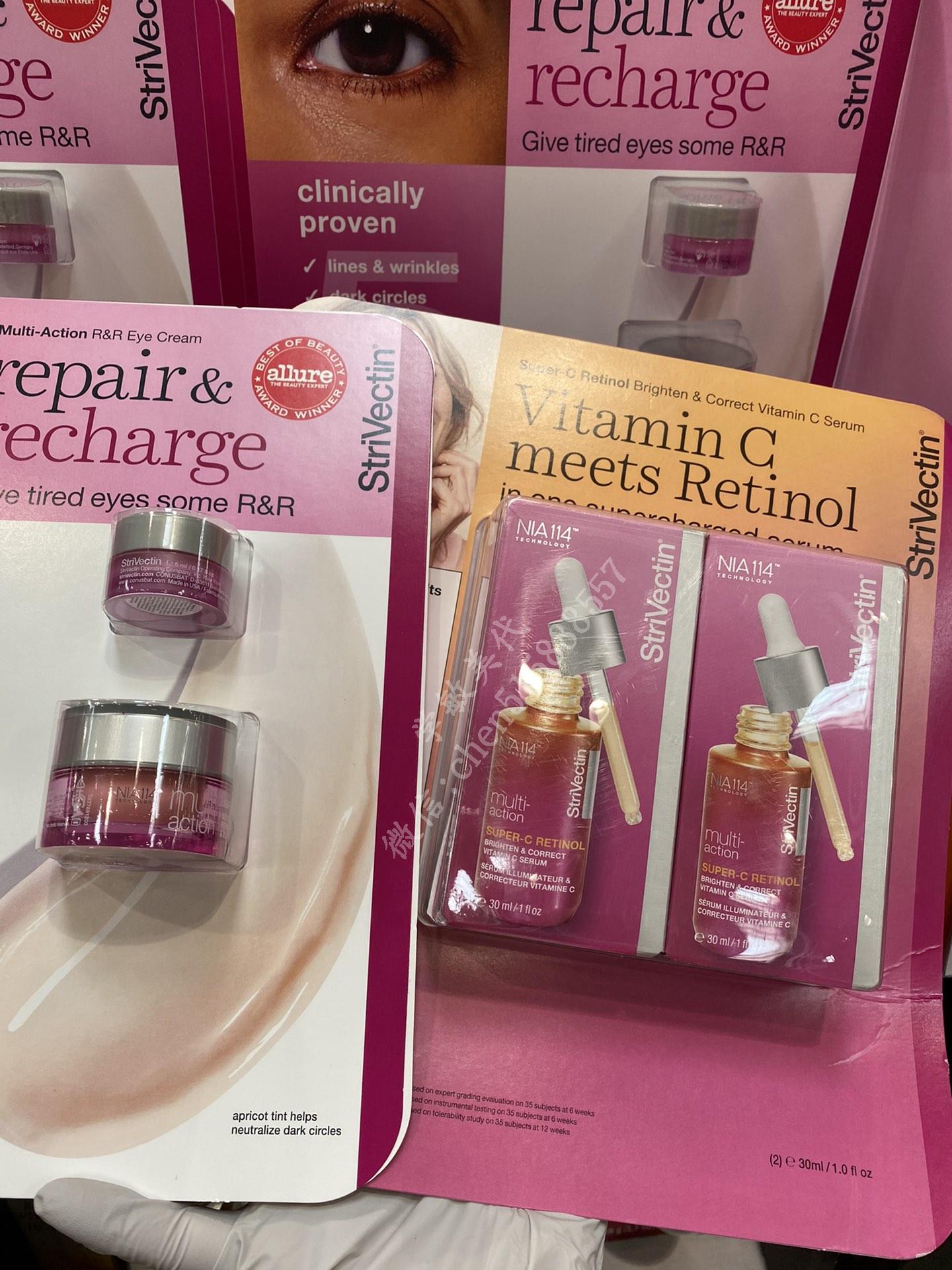 StriVectin斯佳唯婷 眼霜+精华两大正装套装 比肉毒杆菌还厉害的抗皱眼霜#风靡欧美的去皱神器 有“小熨斗 ”之称的抗皱紧致眼霜,女士男士都可以用。 明显减少眼睛周围所有类型的细纹,减轻眼睛周围浮肿的外观,减少屏幕疲劳迹象。使用一周就陆续有明显效果! 斯佳唯婷VC亮白紧致精华,味道非常好闻,吸收超快,完全不粘腻,超温和!富含超高VC的西印度樱桃精华,上脸明显紧实、提亮去暗沉,且含有的视黄醇可平滑粗糙肌肤,淡化皮肤干纹和细纹,紧致肌肤。