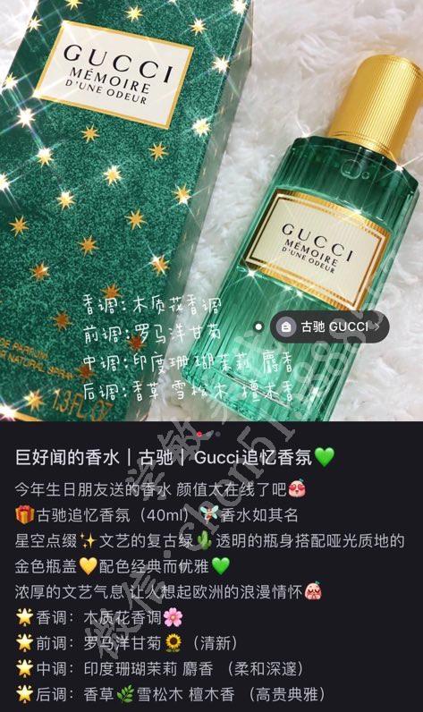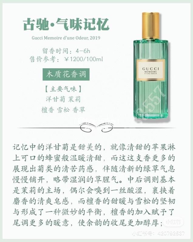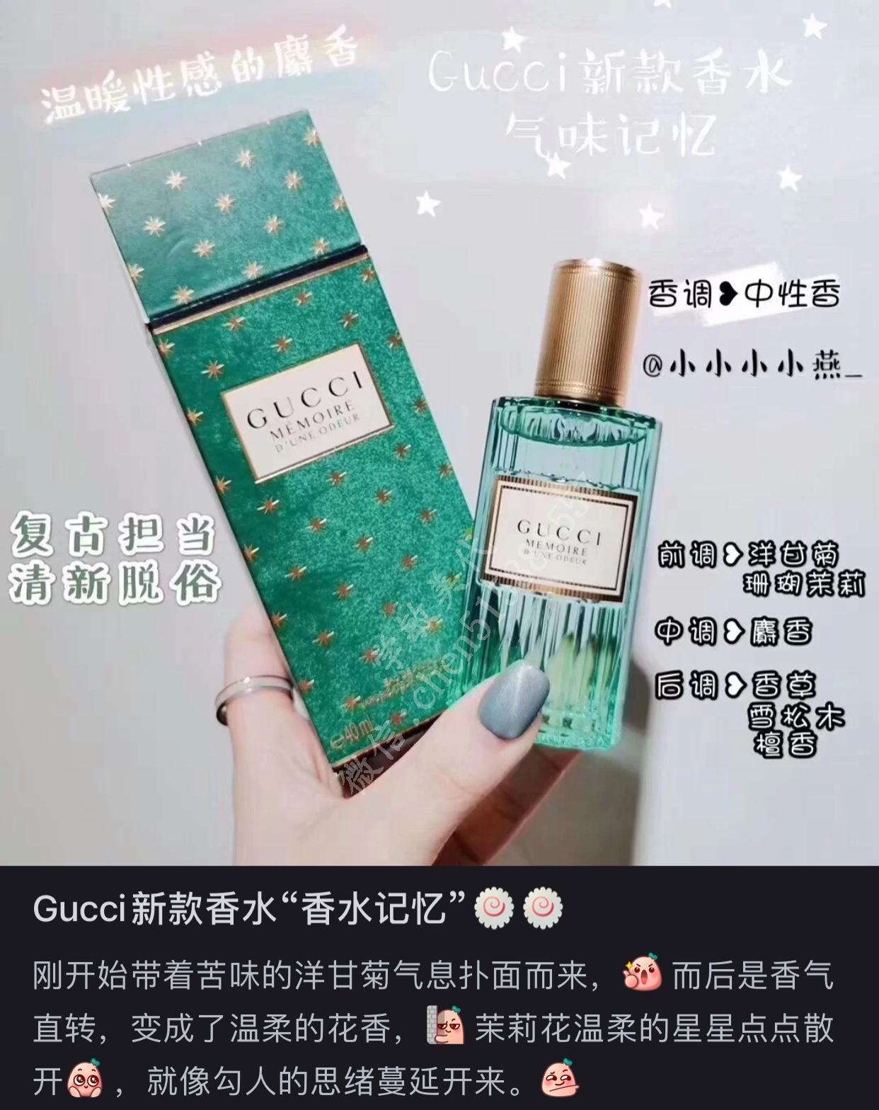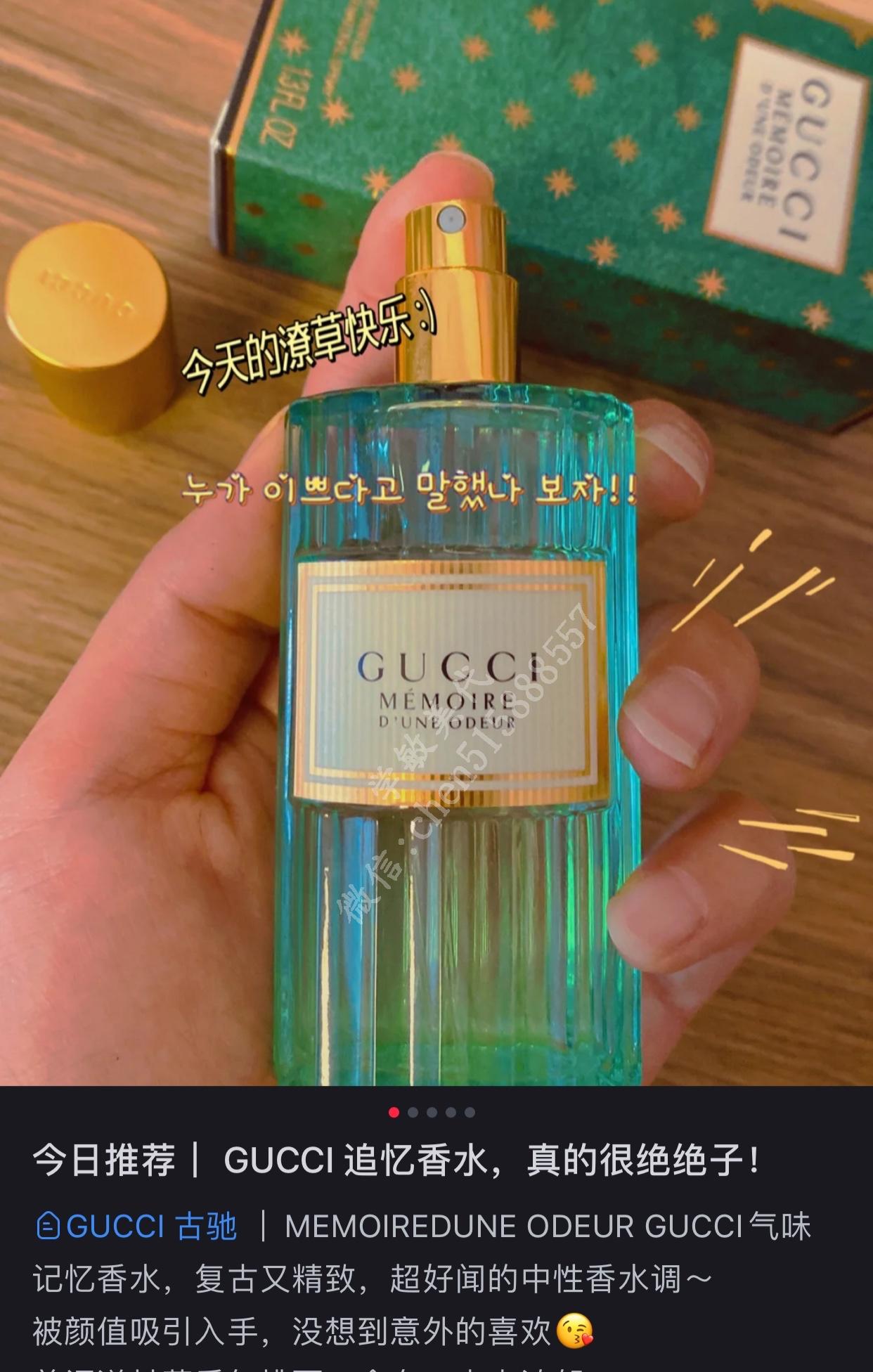 单瓶装Gucci Memoire 气味记忆香水 是一款走在路上会被拦下来询问的一款香水。 相当精致的复古祖母绿欧式风格瓶身及包装星空设计,罗马洋甘菊和印度珊瑚茉莉的气息融合,优雅怀旧充满爱,一款让你勾起美好记忆的香水。 【香调】矿质芳香调; 【前调】罗马洋甘菊; 【中调】印度珊瑚茉莉,麝香; 【后调】香草,檀香木,雪松。。