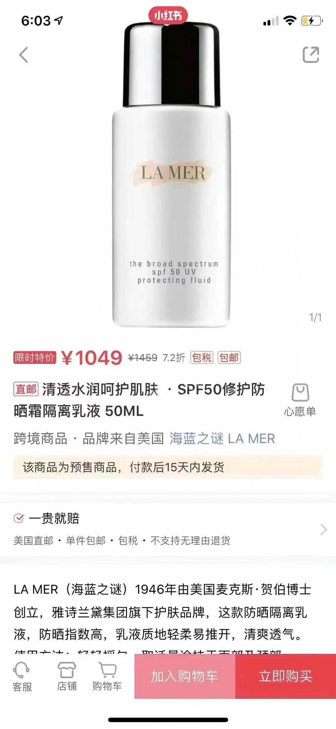 Lamer 海蓝之谜 妍亮防晒霜50毫升,清透修护防晒隔离乳液。SPF50高倍防护,全面防御UVA和UVB紫外线的侵害。