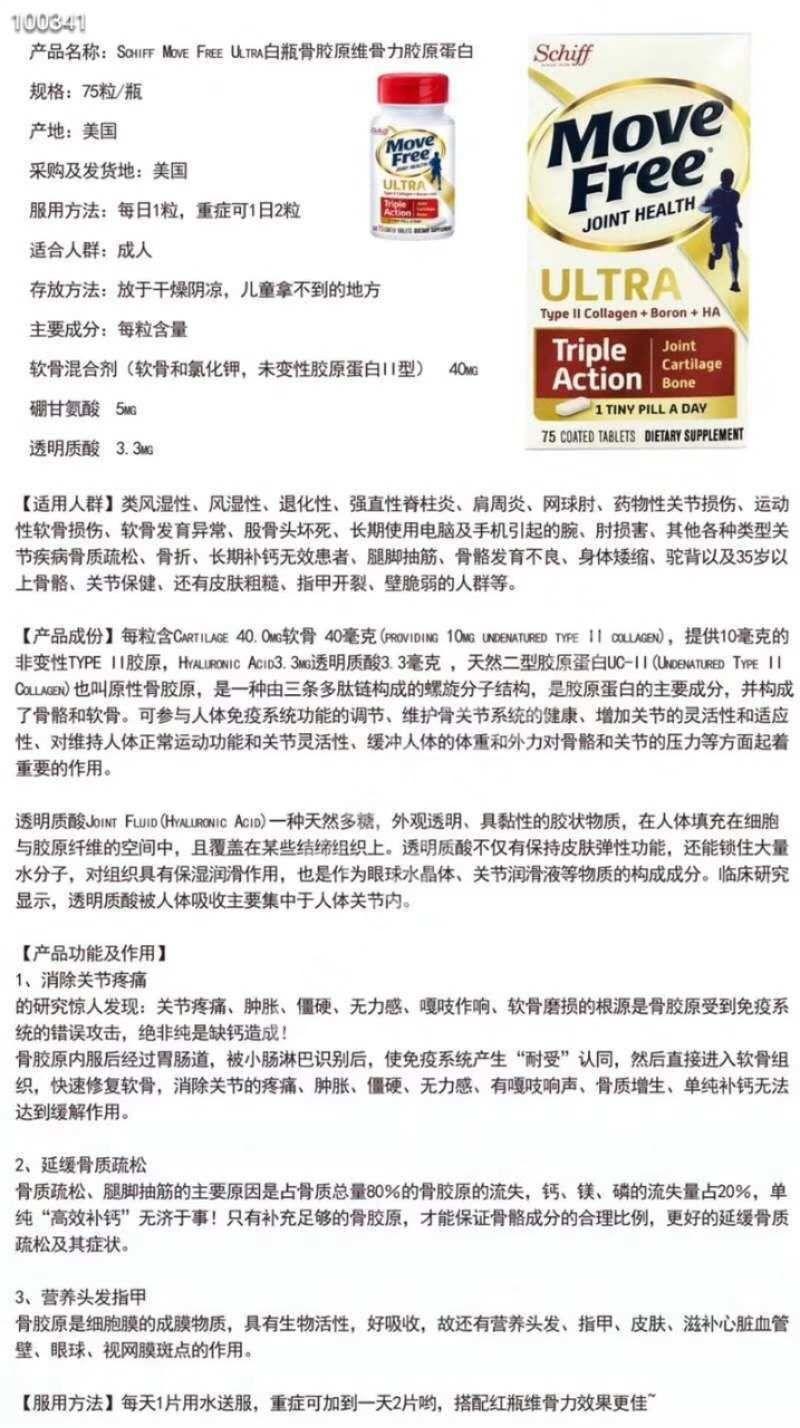 白色浓缩在美国,每10个骨科医生9个会向他的病人推荐schiff维骨力真的是美国最畅销保健品之一!对各种关节修护都有效,美国各医院医师首推的骨骼保健~减轻关节炎疼痛、修复软骨、对关节炎、肩周炎、腰椎、腰椎病、间盘突出、风湿、都适合,预防骨质疏松,通过美国多家权威机构认证~一瓶75粒,每天1粒。move free因其强大的功效,使之成为全球范围内家喻户晓的关节保护神 也因此得到美名:腰关节的软黄金!这个是精华版。