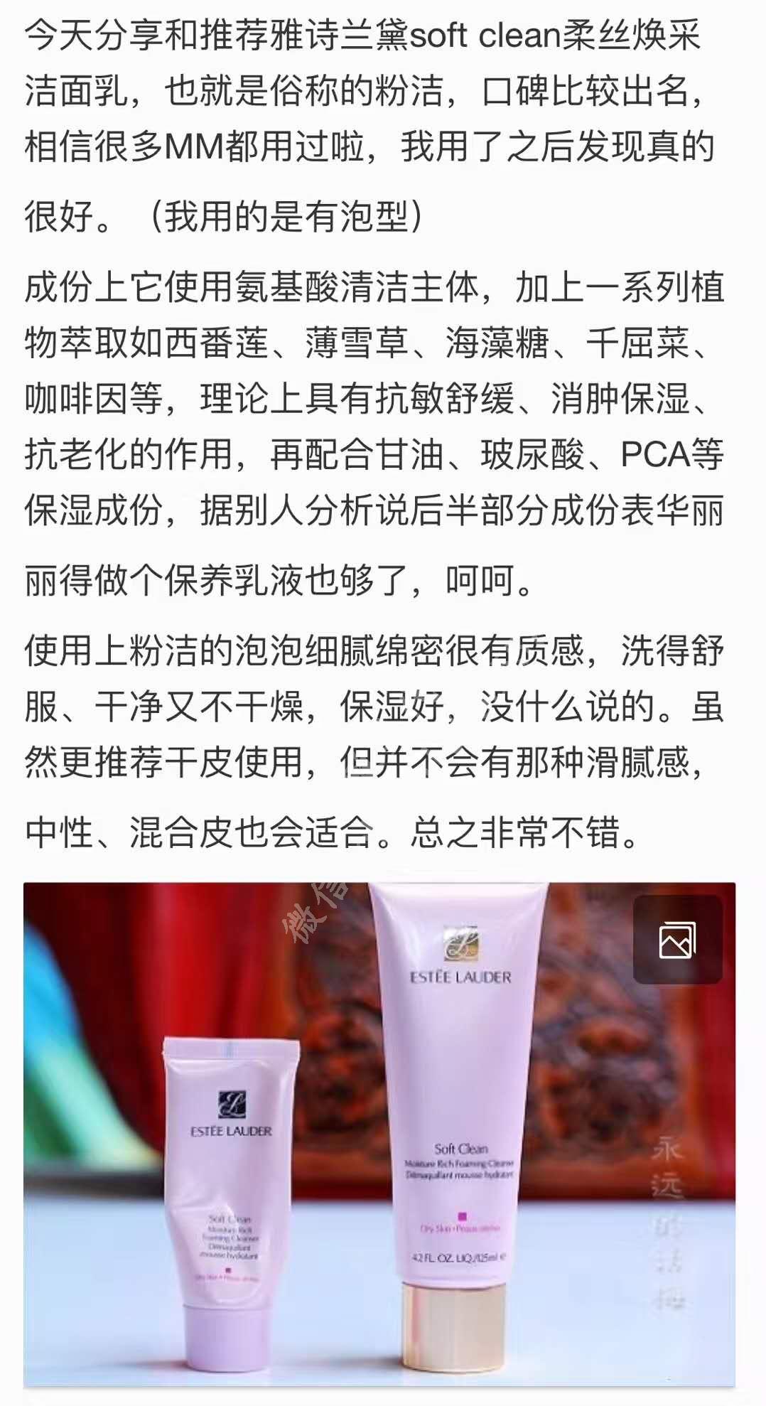 雅诗兰黛唯一一款氨基酸洁面!这款国内可是没有卖的噢!关于氨基酸洁面的好处请自行百度属于氨基酸洁面类,温和有效清洁皮肤,泡沫丰富细腻,这款没有在中国市场销售,美国一度停产据不可靠猜测是因为氨基酸洁面成本高,但是抵不住粉丝的热爱再次问世,美版正宗粉洁,只在美国销售,国内没有哒,韩国和免税店也没有。性价比高高高。125毫升