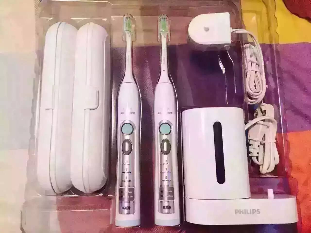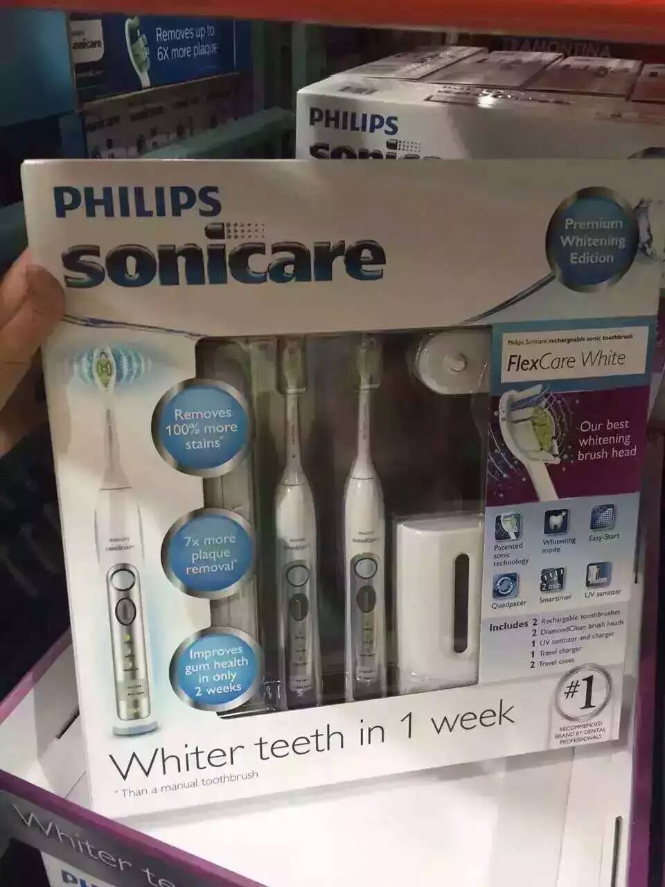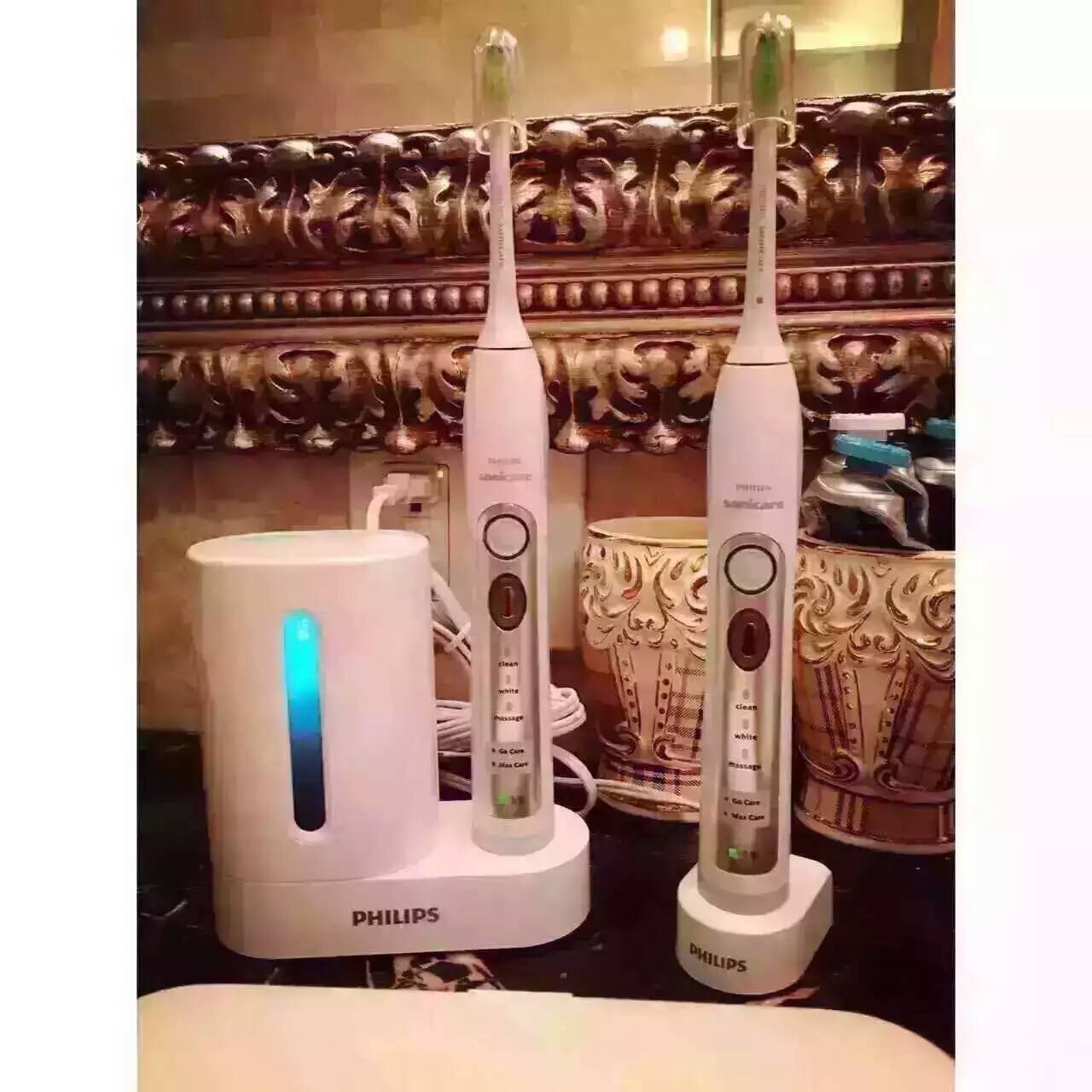 明星黄磊同款 美国飞利浦顶级超声波电动牙刷,用了它之后最大的感受就是好像以前没有刷过牙, 像给牙齿做了美白,各路明星同款啊,终于大特价了!一盒两只装,包括两个Diamond clean刷头,2个电动手柄,一个座充,一个旅行充,一个紫外线消毒器,两盒旅行方便盒。美国最注重牙齿健康啦!!国内一支就不止这价啦