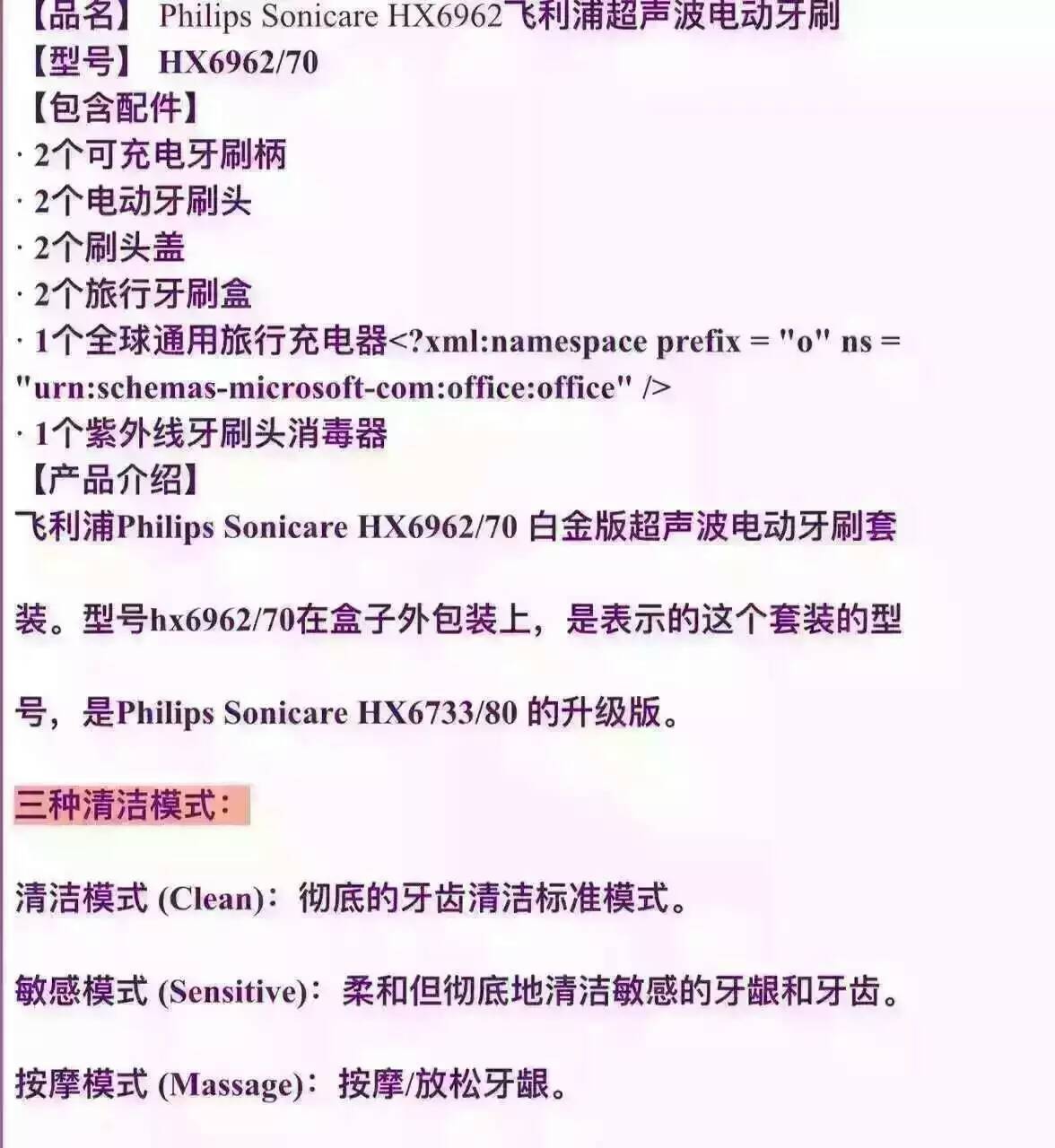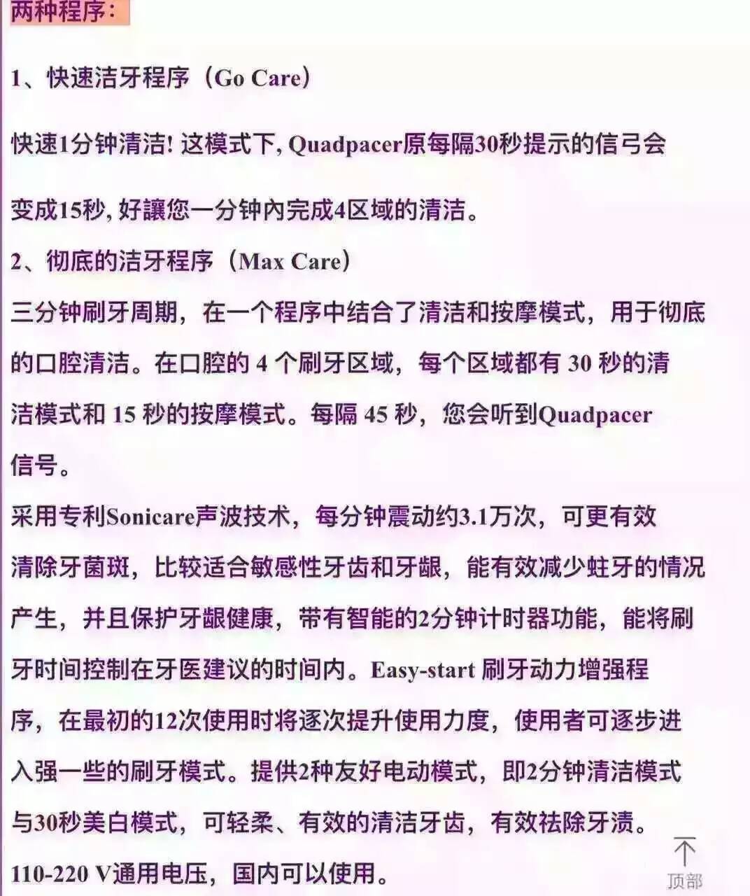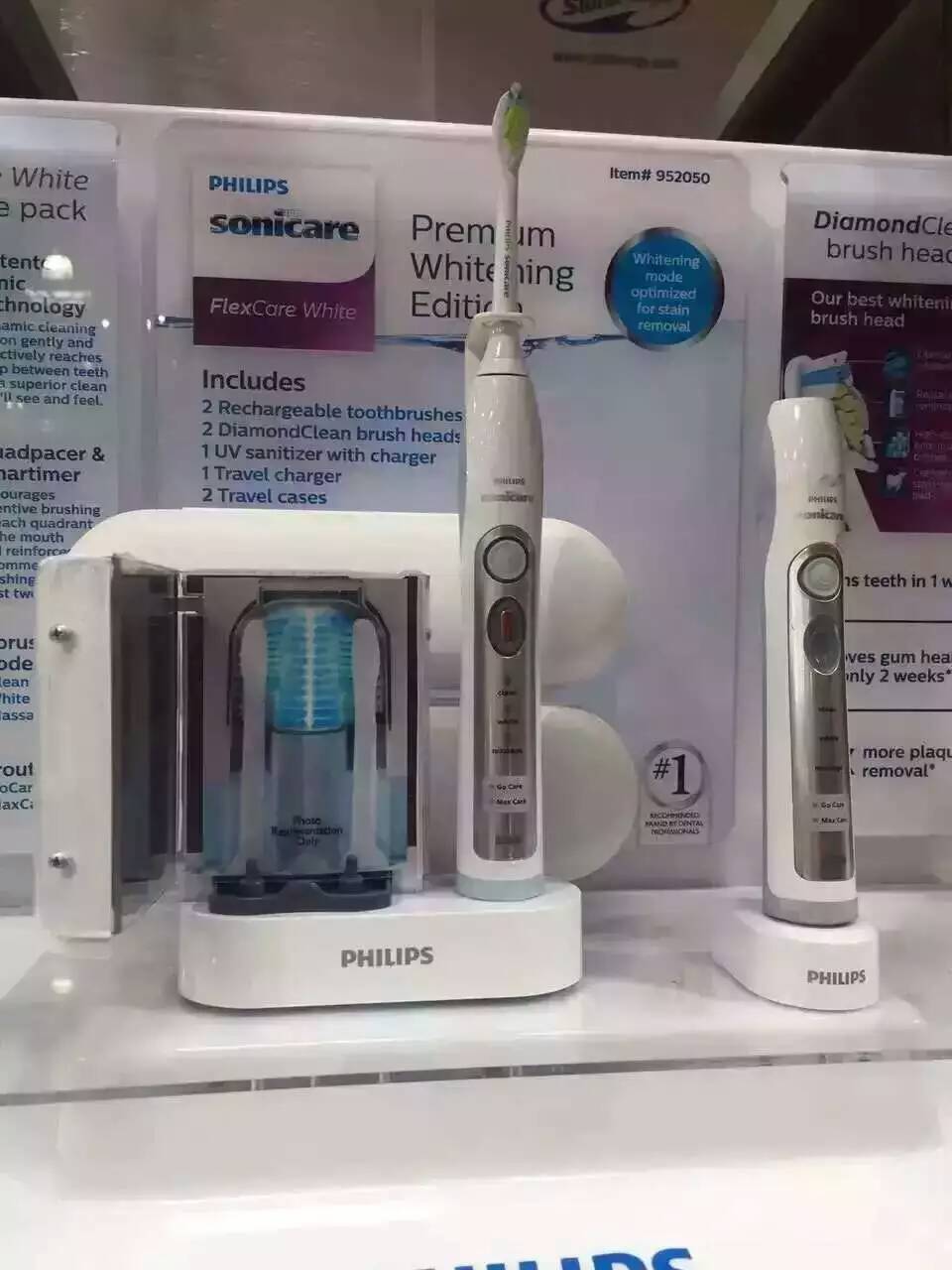 明星黄磊同款 美国飞利浦顶级超声波电动牙刷,用了它之后最大的感受就是好像以前没有刷过牙, 像给牙齿做了美白,各路明星同款啊,终于大特价了!一盒两只装,包括两个Diamond clean刷头,2个电动手柄,一个座充,一个旅行充,一个紫外线消毒器,两盒旅行方便盒。美国最注重牙齿健康啦!!国内一支就不止这价啦
