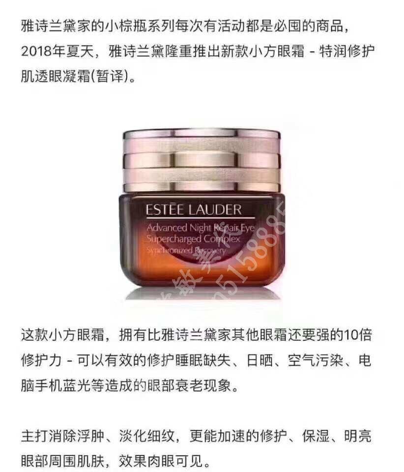美版Estee Lauder 雅诗兰黛明星产品~~ 抗蓝光眼霜正装15毫升, 此款眼霜能有效防蓝光对眼睛的损害,淡化(色素型)黑眼圈,8小时抗氧化,24小时保湿.获得发明专利的产品,不但抗蓝光而且滋润和修复效果呢是以前小棕瓶眼霜效果的10倍