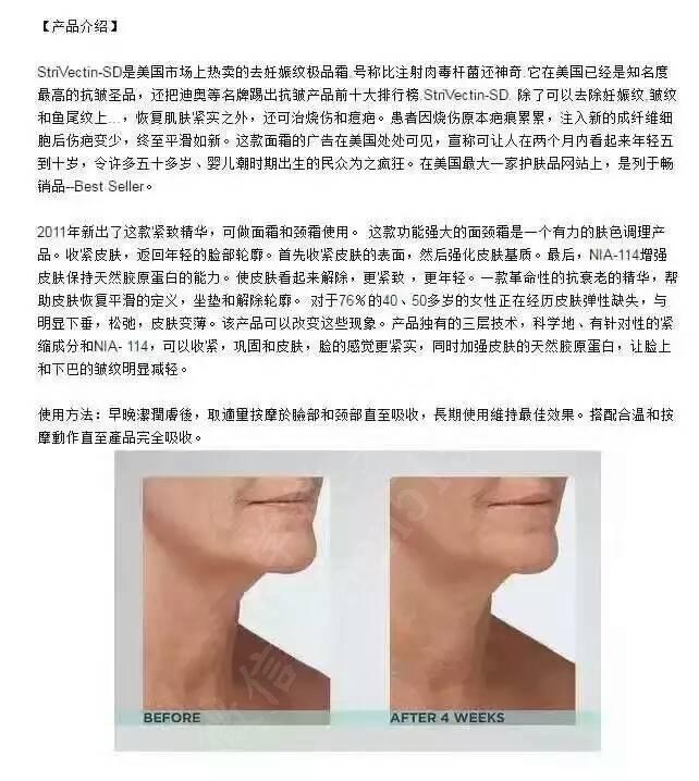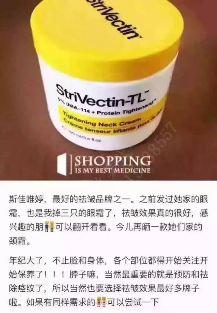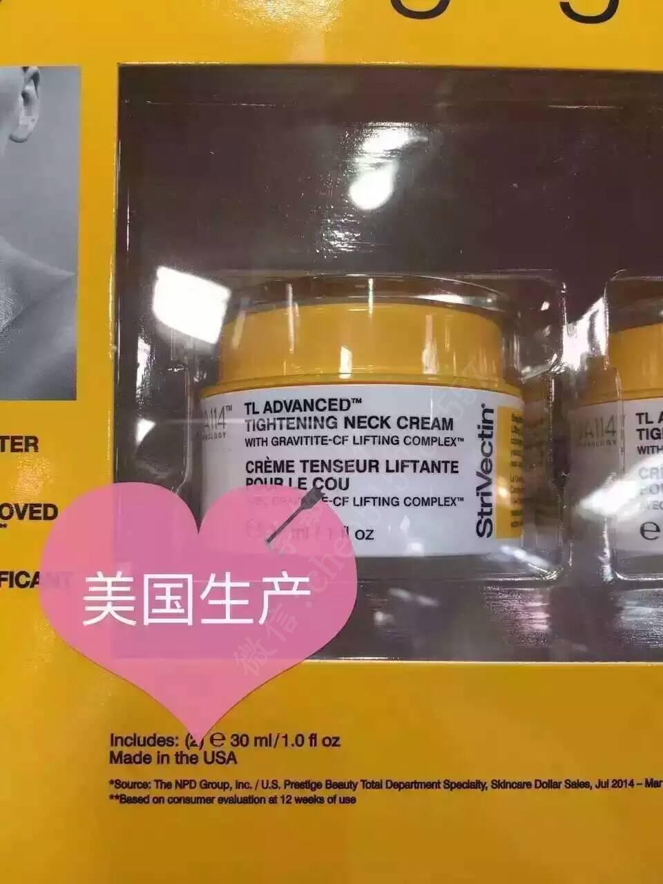 【Strivectin】颈霜~女人最容易看出年龄来的其实是脖子!所以颈霜同样重要噢~这是客人让我找的一款颈霜~也一起推荐给大家:StriVectin斯佳唯婷颈霜~高效紧致颈霜,提拉紧致~美国知名度很高的抗皱圣品~广告上还打着全美脖销量第一!美丽不要放过任何一个死角 ~超值装30毫升X2瓶装